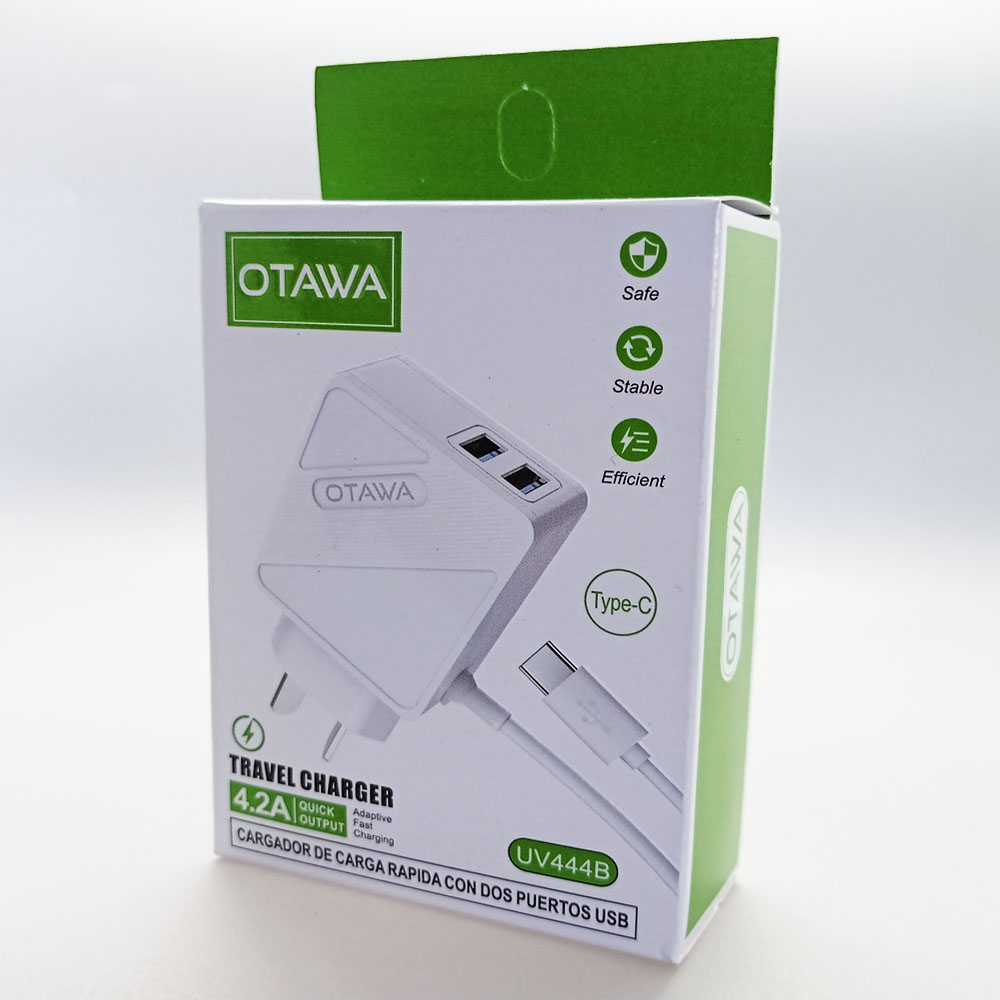 Cargador Otawa tipo C 4.2 A Alta velocidad de carga. Doble USB Color blanco Incluye cable tipo C
