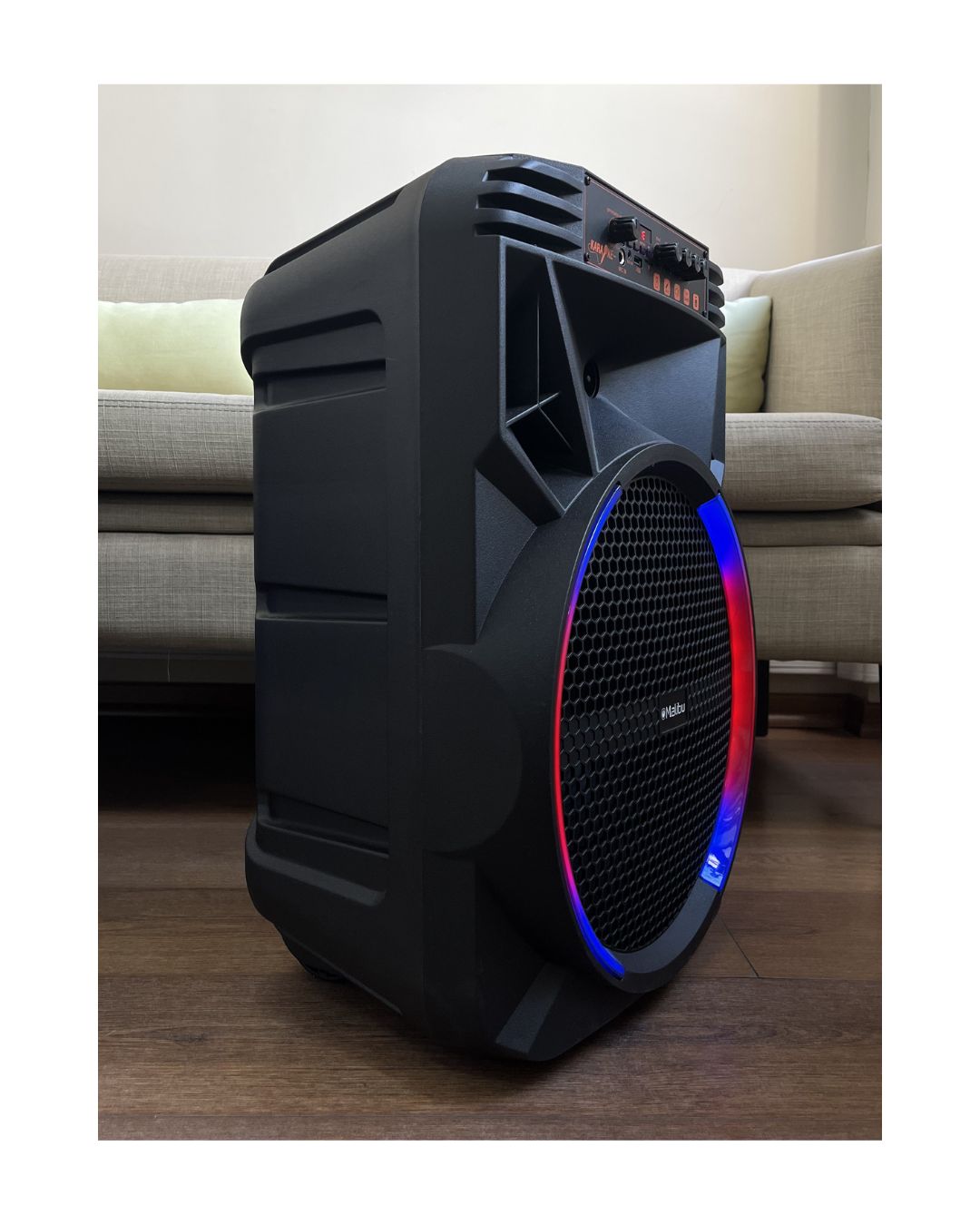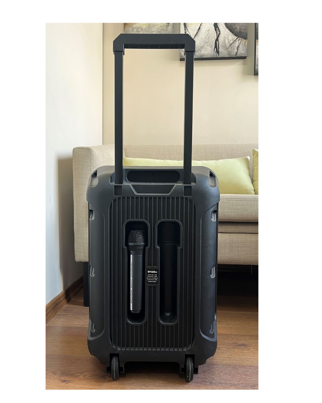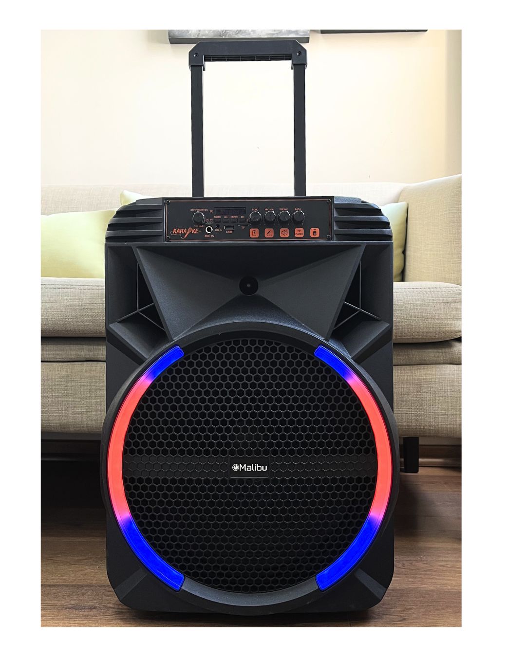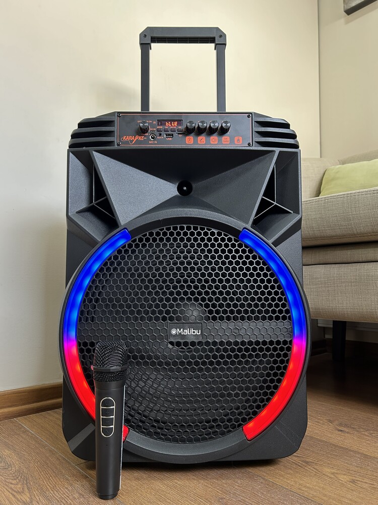 Parlante MALIBU 2*10 Pulgadas. 100W. 6000 mah Parlante tipo valija con Ruedas incluidas Bluetooth. Radio FM. Compatibilidad AUX/USB/TF Equalizador Tamaño: 40*28*57 cm Luces LED dinámicas. Entrada para micrófono. Incluye 1 control remoto (no incluye pila) Micrófono inalambrico incorporado. (Usa bateria recargable tipo CCable incluido) Peso: 4,80 kgs