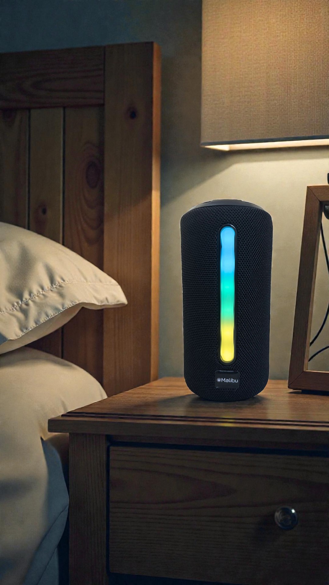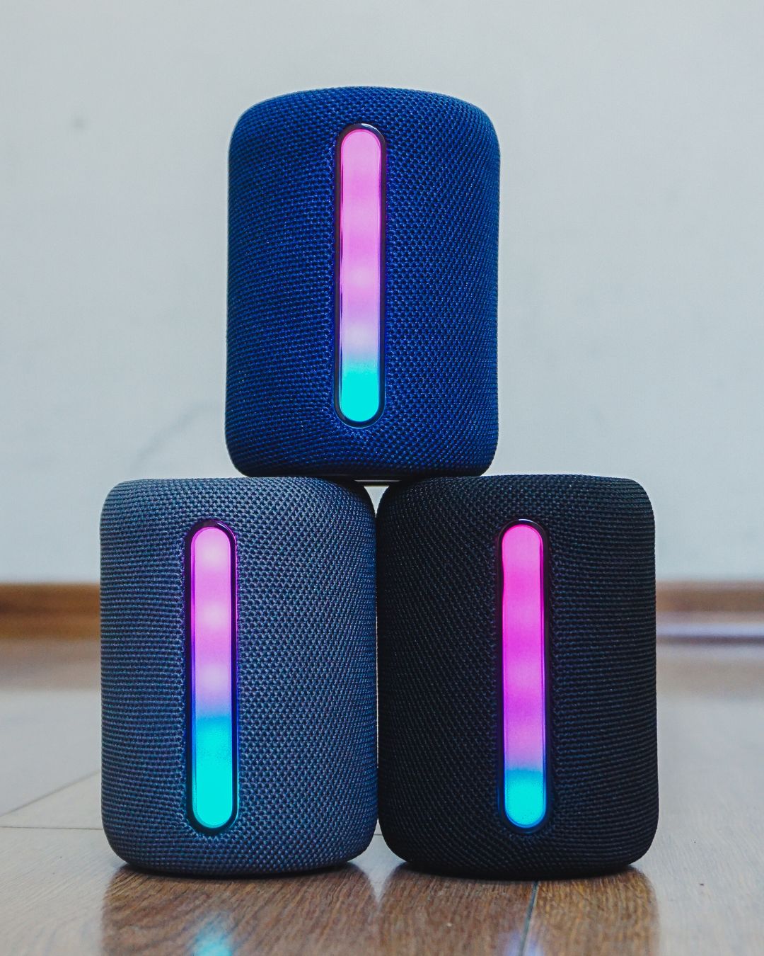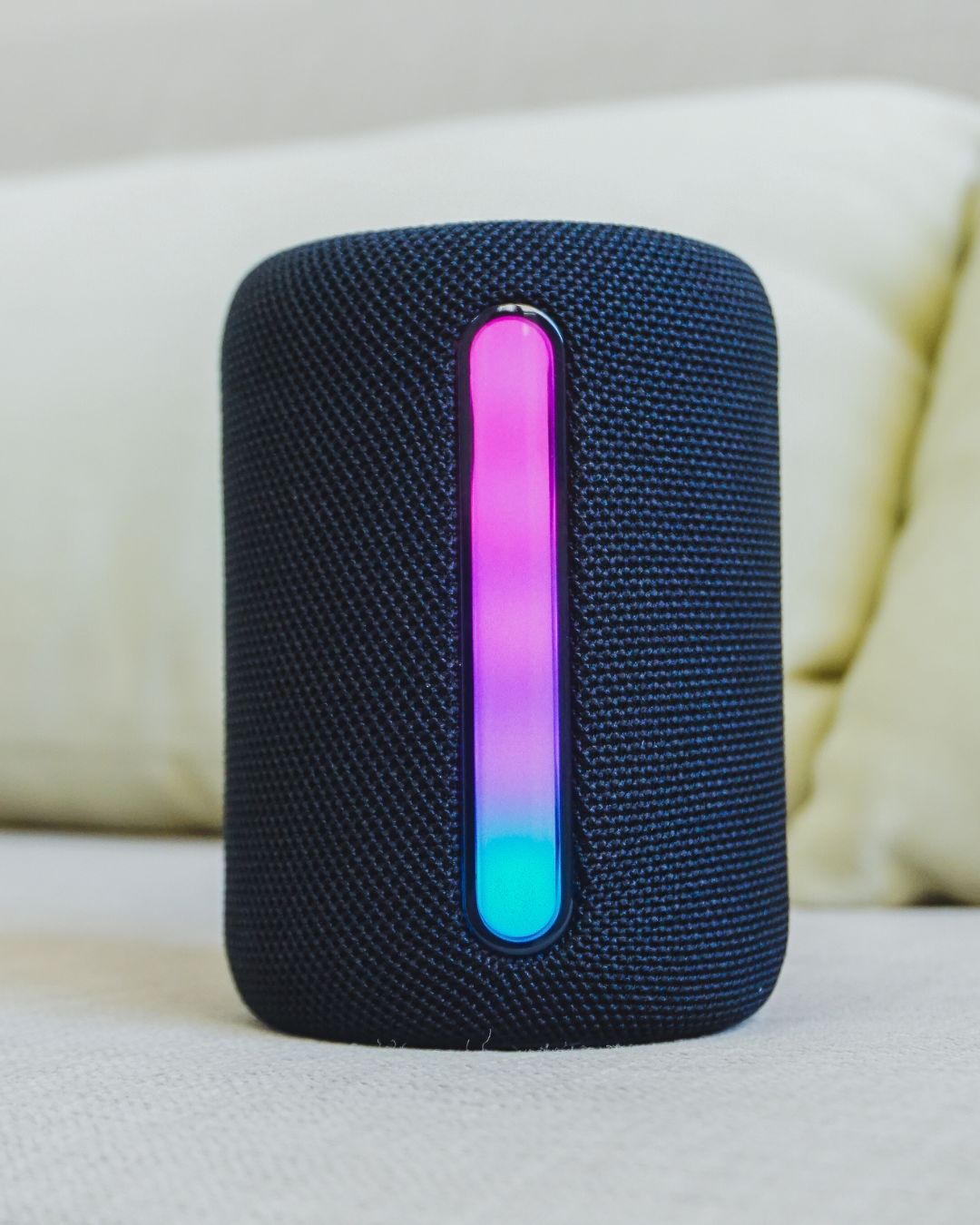 Parlante BT/FM/LUCES RGB RGB/SD/RADIO FM. 6 a 8hs de autonomía. Colores negro, azul y gris. 17cm X 8.5 cm