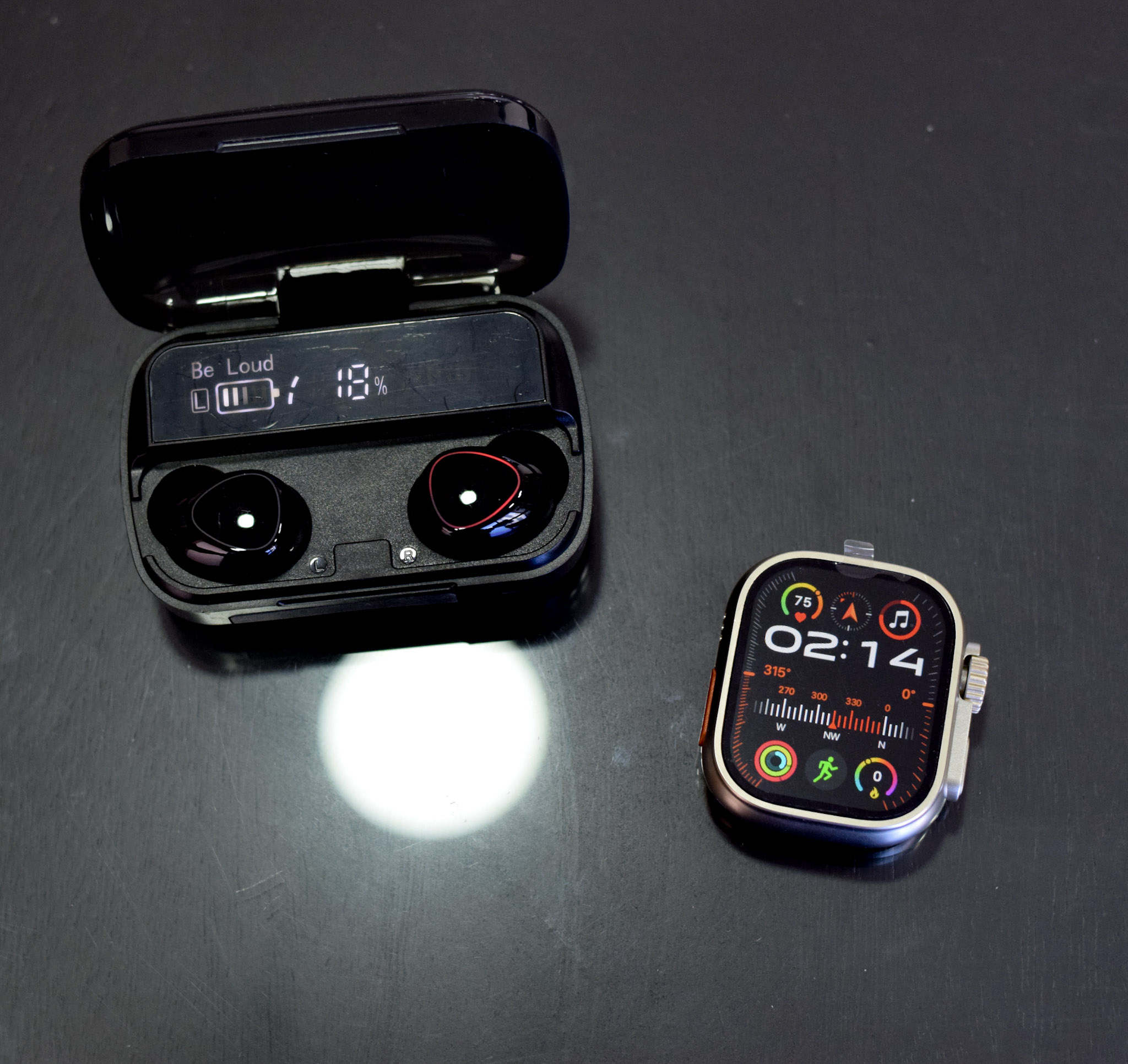 Set de Reloj Smartwatch. Incluye Auriculares tipo earpod y caja de carga con Powerbank. Incluye 7 correas para el reloj. Cargador magnetico. El Smartwatch es de ultima generación con bateria de larga duración, interfase touch rapida. Monitor deportivo, medidor de salud, Calendario, monitor de sueño. Recibe llamadas y mensajes con microfono incorporado.